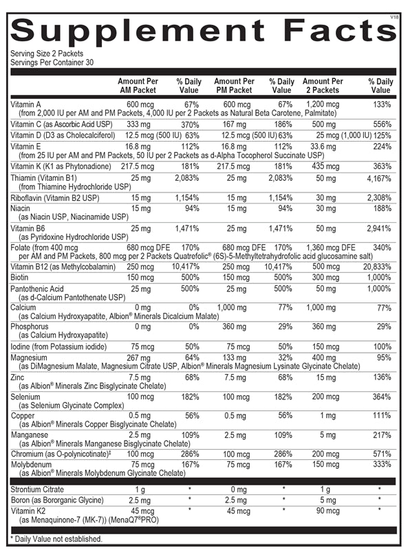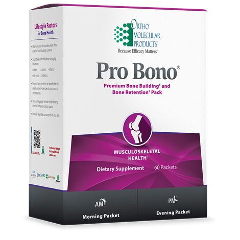 BMD is determined by a lifelong process called bone remodeling. Bone remodeling occurs when bone tissue is removed from the skeleton (bone resorption) and new bone tissue is formed. Osteoclasts are cells involved with breaking down bone, while osteoblasts create a protein matrix primarily of collagen, resulting in the remineralization of bone and thereby promoting bone formation. While calcium is an effective starting point for promoting bone health, other nutrients are required for bone mineralization. Nutrients such as strontium, magnesium, vitamin D, K and C, B complex vitamins, and trace minerals significantly enhance bone remodeling and increase bone strength. Pro Bono® provides a comprehensive approach to bone health by offering a full spectrum of nutrients that are required in the bone mineralization process. Pro Bono® also contains nutrients that help maintain an optimal osteoclast to osteoblast ratio.